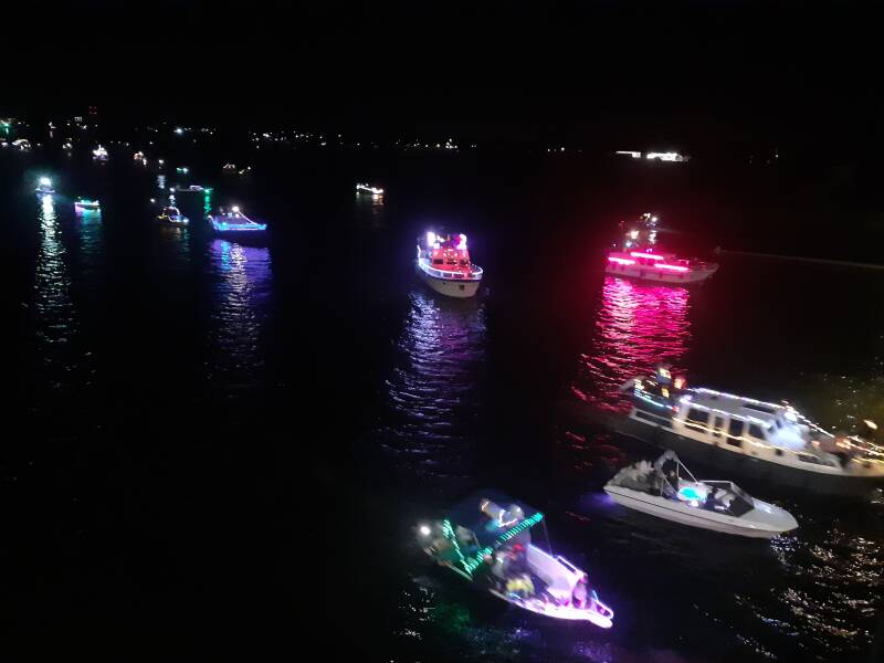 Von der Brücke hat man einen herrlichen Blick auf die vorbei fahrenden Boote. Einfach herrlich und ausgelassen wird gefeiert und Musik abgespielt. Schön anzusehen, die Lichter in der Nacht.