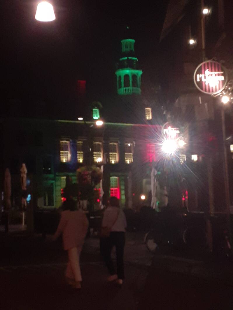 Abends über den Roermonder Marktplatz schlendern. Die Gastronomie schließt so langsam ihre Tore. Bei Burgers Enzo/ Juffrouw Coco bekamen wir noch einen Platz auf der Außenterrasse. Kopf ausschalten und das Lichterspiel des Stafhuis genießen, natürlich auch die Kulinarik des Enzo.