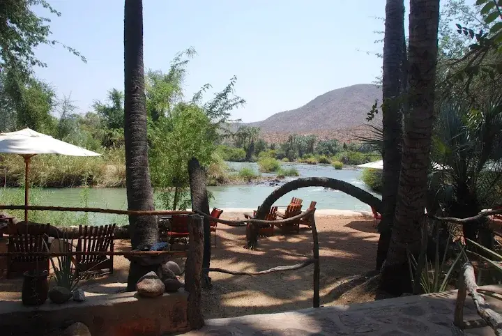 Epupa Camp: Rund 800 Meter flussaufwärts gelegen, mit Campingplatz, Chalets und luxuriösen Safarizelten. Zusätzlich werden hier Aktivitäten wie Rafting organisiert.